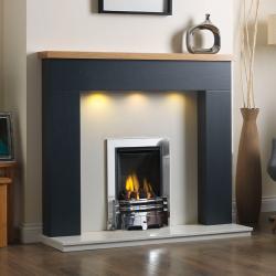 The Pimlico Mantel is shown here in Storm and Matt Oak, with a Nacarado Marble back and hearth and Gas Fire with a Chrome Trim. The Pimlico is available in Oak Veneer and Pastel Finish.
