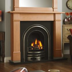 The Cumberland Mantel is shown here in Matt Oak, with a Black Granite Hearth, Polished Clifton Arch Casting, and an Inset Gas Fire. The Cumberland is available in Solid Oak, Capital Oak and Pastel Finish.