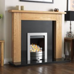 The Didsbury Mantel is shown here in Clear Oak, with a Black Granite Marble back and hearth, and a Gas Fire complete with a Chrome Trim. The Didsbury is available in Solid Oak, Capital Oak, Oak Veneer and Pastel Finish.